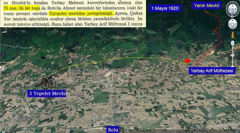 Asiler Yarbay Arif Müfrezesinin Seben üzerinden Bolu’ya geldiğini daha önceden haber almışlar ve 12 gün önce 21 Nisan 1920 günü Hendek’te şehit ettikleri Yarbay Mahmut Nedim’in 24’üncü Tümeninden ele geçirdikleri bir topu Çamyayla ve Ilıca köyleri arasındaki Üçtepeler mevkiine Sultan Köyünü ateş altına alacak şekilde mevzilendirmişlerdir.